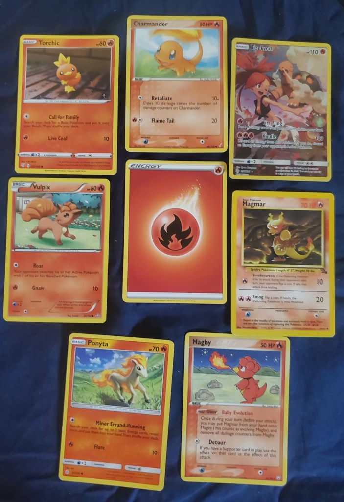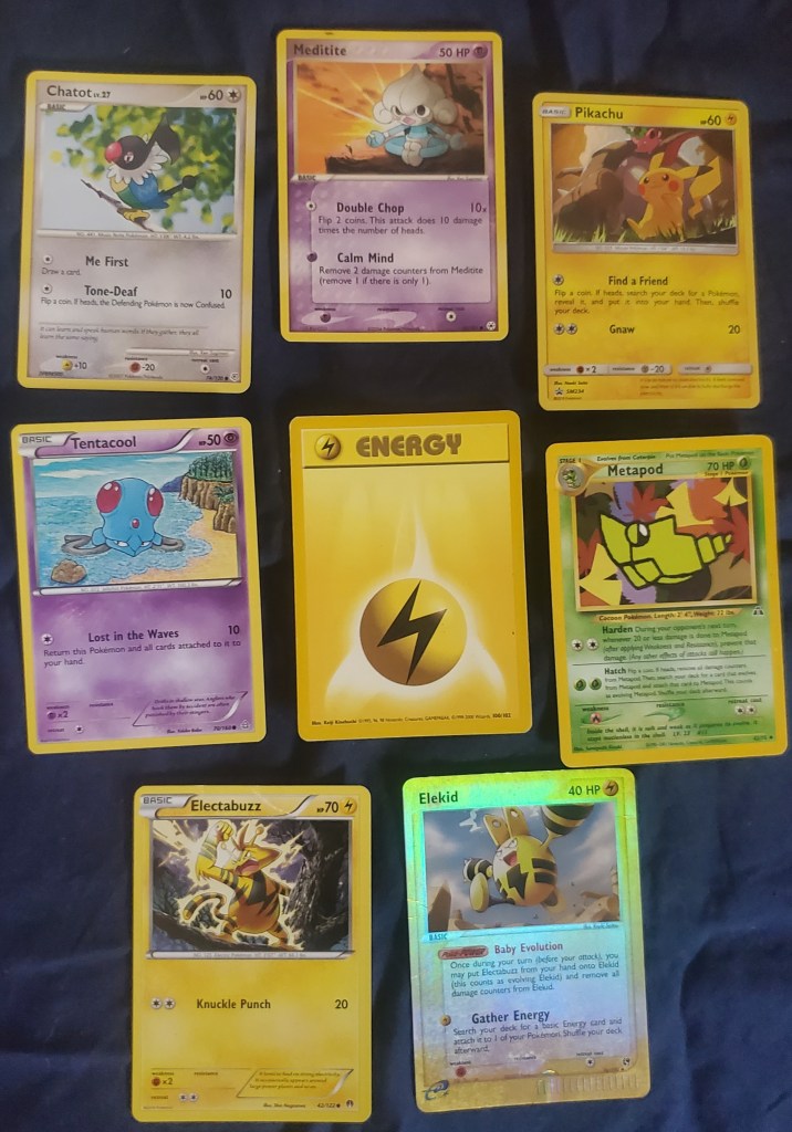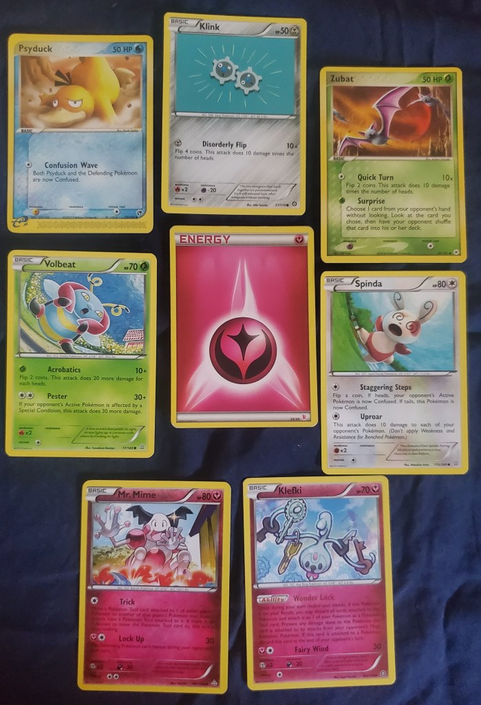 Since I’m really into the Chaos Star and have correlated it with the eight trigrams of I Ching I clumped my cards around the eight categories. The correspondences are mine, not by the book, if there even IS such a book. First term is the color in the Chaos Star, the middle term is my association that connects them (to me, anyhow!), the last term is the name of the Trigram. I didn’t include it, but Evee is also in my deck to represent me, or the person who I am reading for. He’s that little fox guy that evolves into eight different Pokémon. Fitting, right?